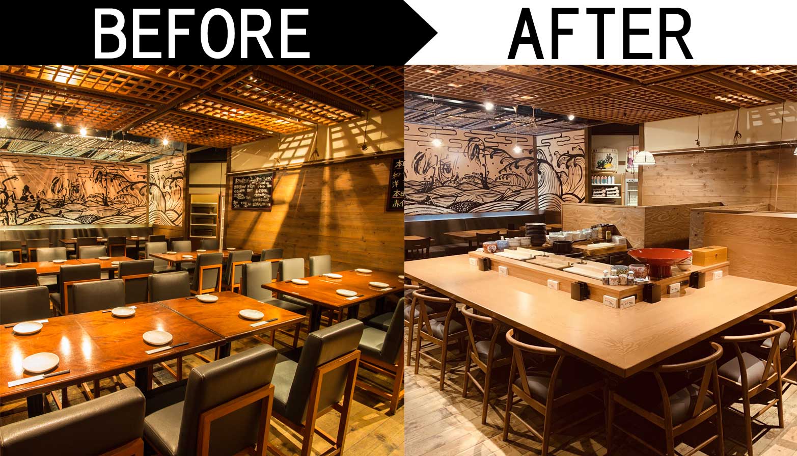 テーブル席の一部を「コの字型のカウンター席」に改装、「ボックス席の増設」を行いました。