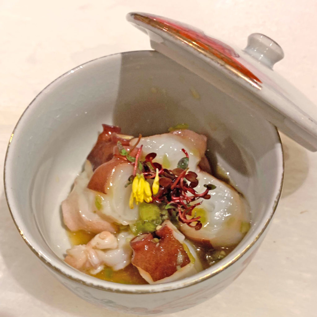 本来、お刺身で楽しめるほど新鮮なタコをぶつ切りにして、自家製わさびダレで和えました。